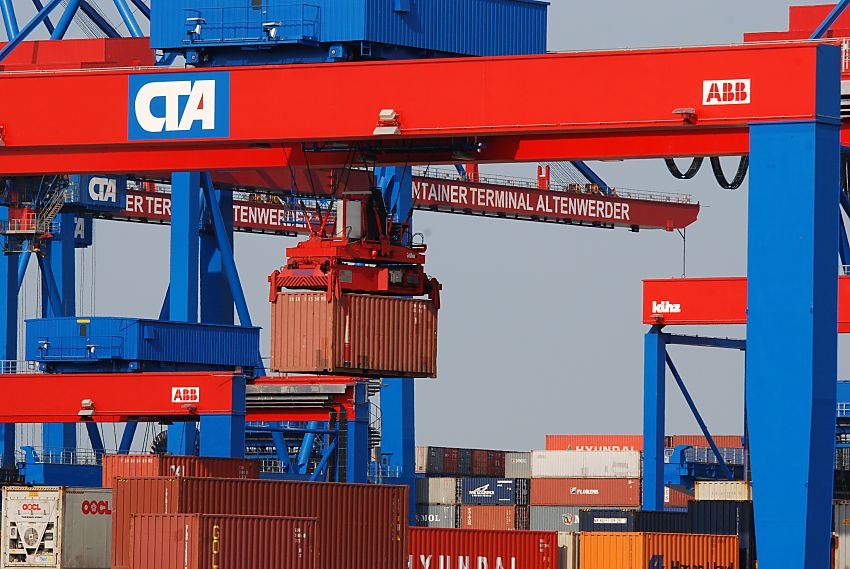 Im Hintergrund die Containerbrücken mit dem Schriftzug CONTAINER