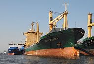 Feeder kommt von der Elbe - der rote Container Carrier fährt unter