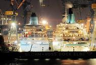 011_71_6746 Das zweitgrößte Passagierschiff de Welt, die FREEDOM OF THE SEAS dockt im Trockendock Elbe 17 der Hamburger Werft Blohm + Voss ein. Das Kreuzfahrtschiff hat eine Länge von 338 m und eine Breite von 56 m während das Dock die Maße 351 x 59 m aufweist. Der vordere Teil des Schiffs ist schon in das Dock >> |