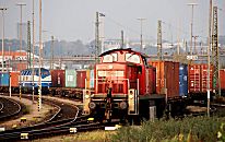 011_15671 Blick auf den Güterbahnhof vom Container Terminal Altenwerder; im Vorder- grund ein leerer Lastzug; grosse Bahnkräne überspannen die Bahn- gleise und beladen die einzelnen Waggons mit ihrer Containerfracht. Der Bahnkran transportiert den Container vom Transportchassis zum Güterzug. >> |