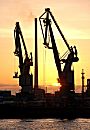 Sonnenuntergang im Hamburger Hafen - zwei grosse Hafenkräne im Gegenlicht der untergehenden Sonne.